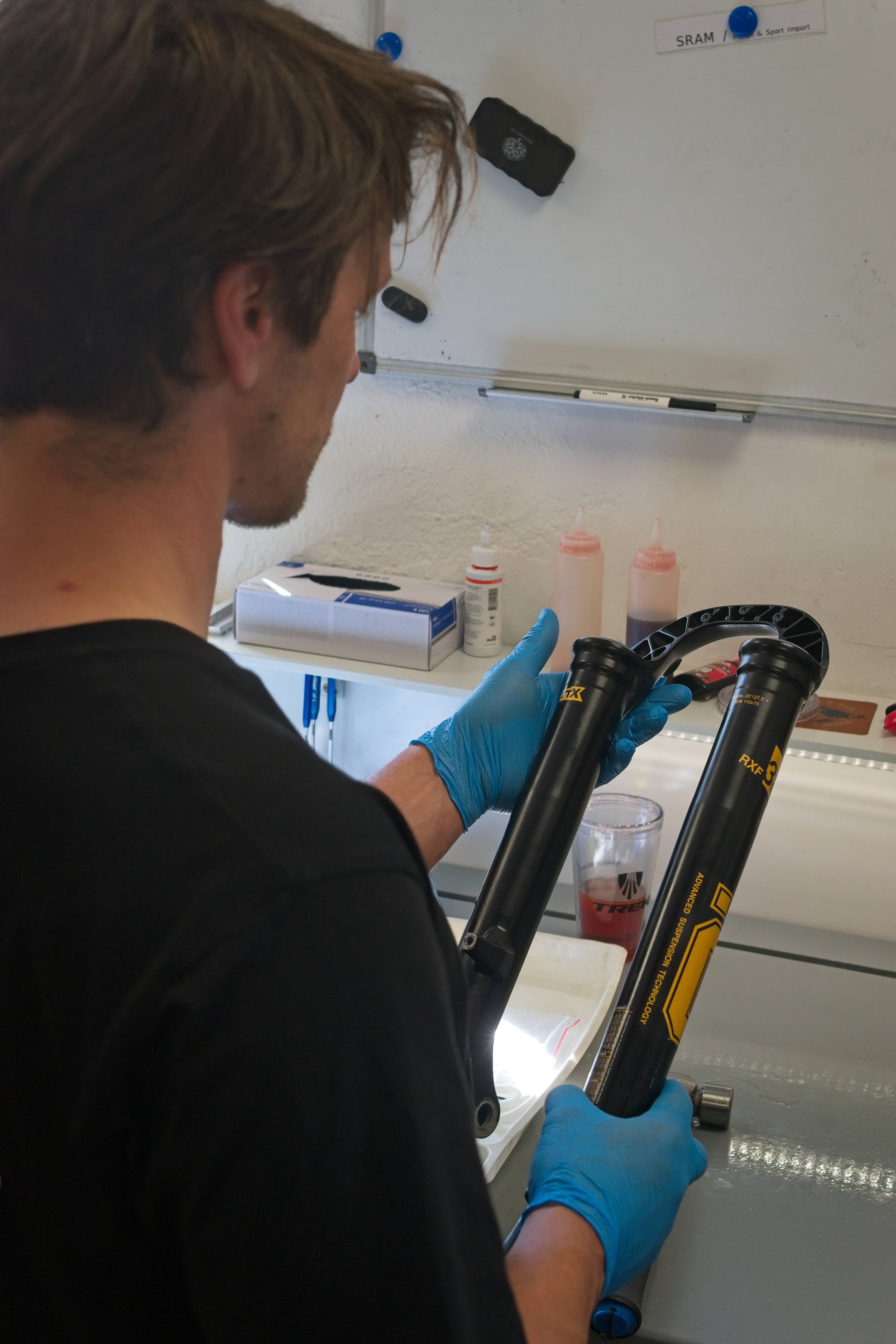 Mit der Zeit können sich die Buchsen an Dämpfer oder Umlenkung minimal verschieben oder verspannen – das beeinträchtigt das sensible Ansprechverhalten des Fahrwerks. Beim Justieren der Buchsen prüfen wir das komplette System auf Spiel, Verspannungen und Achsflucht. Durch präzises Ausrichten sorgen wir dafür, dass alle Lagerachsen wieder perfekt fluchten und sich die Dämpferbewegung frei und ohne Reibung entfalten kann.Das Ergebnis: ein deutlich ruhigeres, feinfühligeres Fahrgefühl und optimale Kraftübertragung – spürbar bei jedem Trailabschnitt.